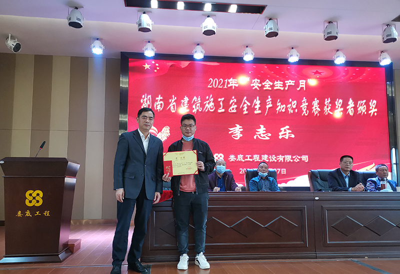 5總工程師李偉(左一)為湖南省建筑施工安全生產(chǎn)知識(shí)競(jìng)賽獲獎(jiǎng)?wù)哳C獎(jiǎng)