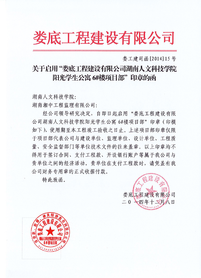 關(guān)于啟用人文科技學(xué)院陽光學(xué)生公寓6#樓項(xiàng)目部印章的通告